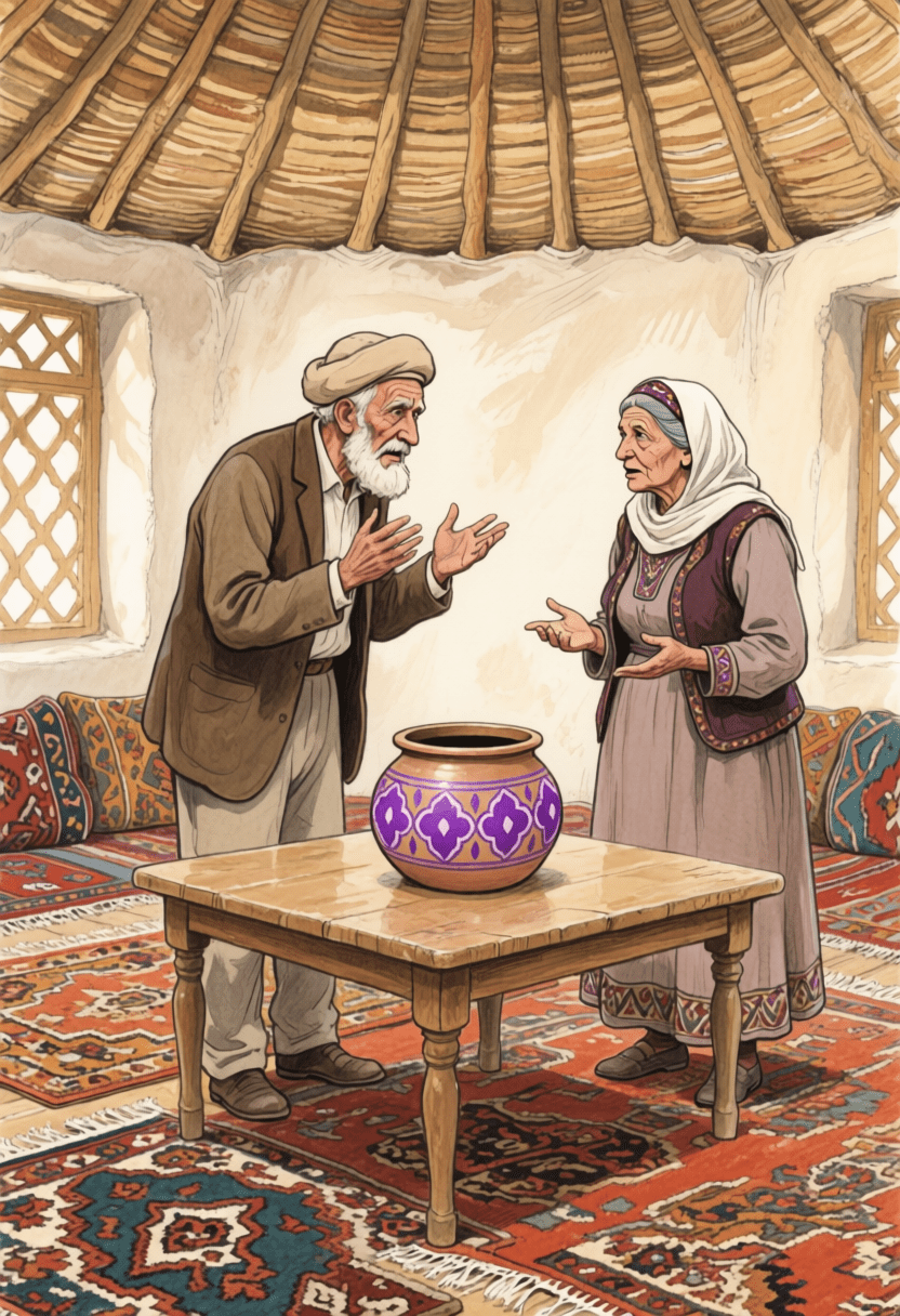 Domačin mu je hitro razložil težavo in lončar je začel brskati po svoji torbi. “Iščete lonček s turkiznimi vijugami? Naj vidim … to ni ta … ta je preveč okrogel … Če bi vedel, da bom moral sredi večera reševati uzbeške pravljice, ne bi ostal v svoji delavnici, bil bi že doma in jedel riž. Vedno isto! Vsi bi radi čudeže, nihče pa ne bi počakal, da se glina posuši! No, pa sem ga našel!”